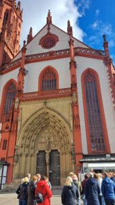 Mit ein wenig Verspätung, da 3 Teilnehmer nicht am vereinbarten Platz angekommen waren, fuhren wir nach einer Frühstückspause an einem Autobahnrastplatz nach Würzburg. Hier wurden wir bereits von 2 Gästeführerinnen erwartet. Mit viel Begeisterung wurden wir durch die Altstadt von Würzburg geführt und haben viele besondere Bauwerke, wie den Dom, die Kilianskirche, das historische Rathaus und die gotische Marienkapelle, die als Höhepunkt spätgotischer Baukunst in Unterfranken und als Nachfolgebau einer zerstörten Synagoge gilt, besucht. Die Marienkapelle ist auch durch die berühmten Figuren von Tilman Riemenschneider „Adam und Eva“, die am Südportal angebracht wurden, bekannt. Inzwischen wurden die Figuren durch Kopien ausgewechselt und die Originale begegneten uns dann im Museum für Franken, das wir am Nachmittag besucht haben. Vorher ging es jedoch zum Essen in den „Alten Kranen“, direkt am Main.